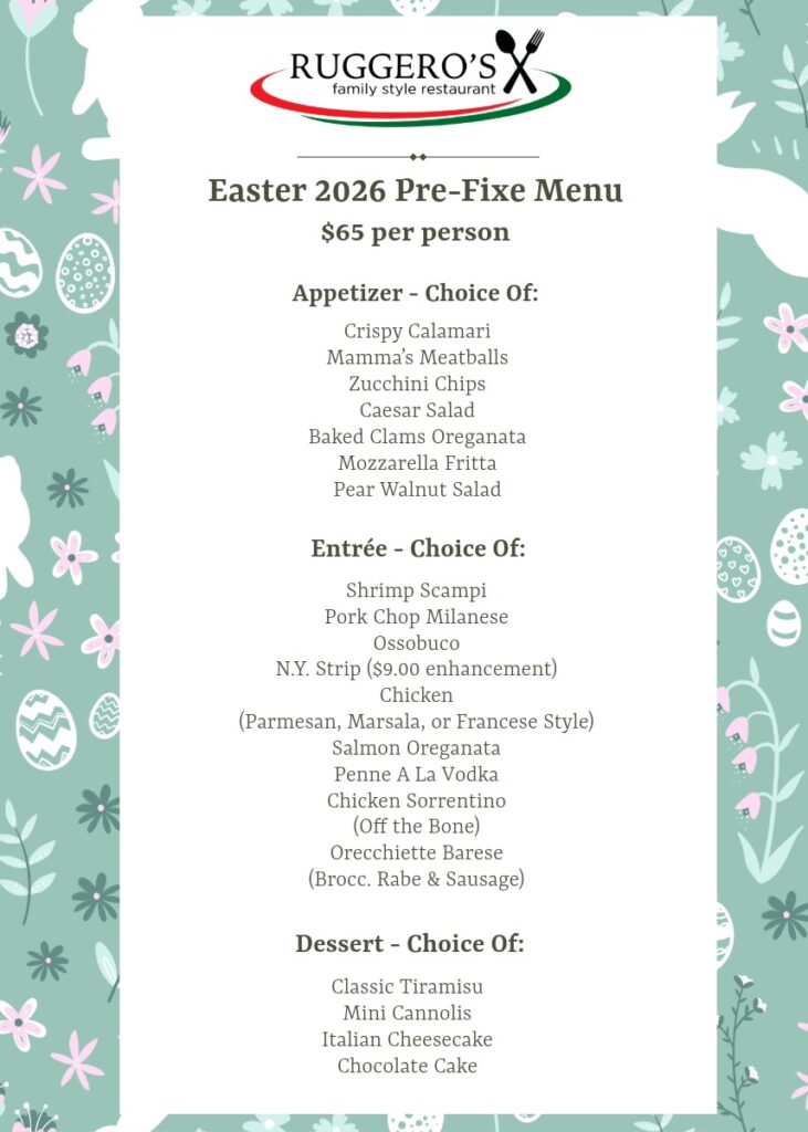 Celebrate Easter Sunday at Ruggero’s with a special Pre-Fixe Dinner served from 12:00 PM to 7:00 PM. Gather your family and friends and enjoy an afternoon of exceptional cuisine, warm hospitality, and the comforting flavors you love. Our chefs have thoughtfully prepared a festive menu that blends seasonal ingredients with classic Italian tradition, creating a memorable dining experience perfect for the holiday. Let us take care of the cooking while you relax, connect, and celebrate Easter around the table with us.